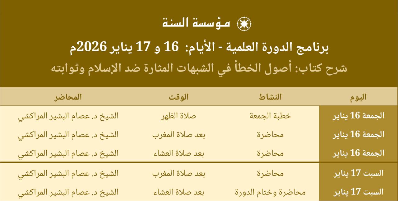 وانطلاقًا من هذه المسؤولية، تدعوكم مؤسسة السنة بلاهاي إلى حضور دورة علمية مميّزة