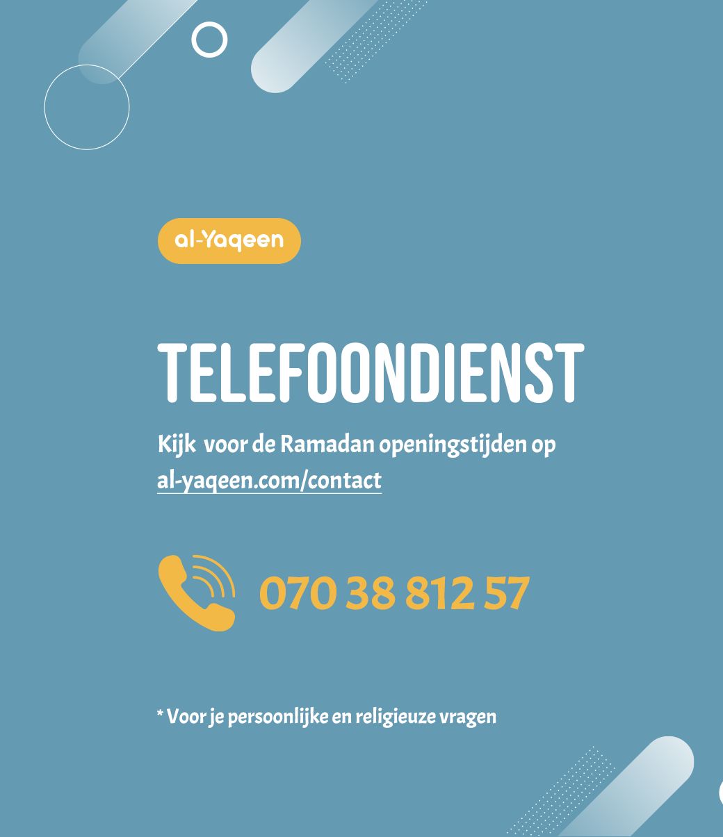 Tijdens de maand Ramadan hebben we onze telefoondienst aangepast. Kijk voor de actuele openingstijden op Telefoondienst in de Ramadan.